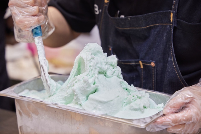 ジェラート職人が作ったジェラートを1つ1つ丁寧にカップに入れます。
