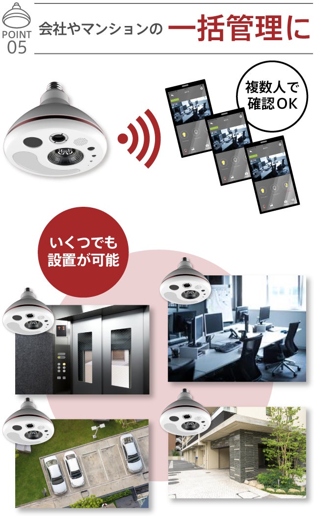 どこにもある電球にカメラを入れれば、隠蔽性が高くなり、配線工事不要なので最適なソリューションではないかと考案された商品です。