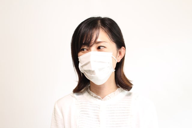 マスクの紐を耳の下に通します。