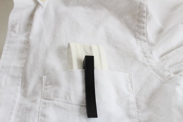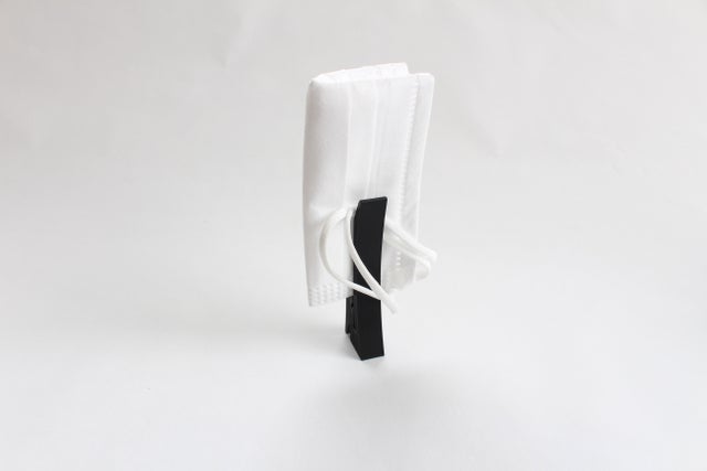 マスクを折りたたんでクリップさせます。スタンド機能でマスクが机などに触れない為、清潔にちょい置きが出来ます。