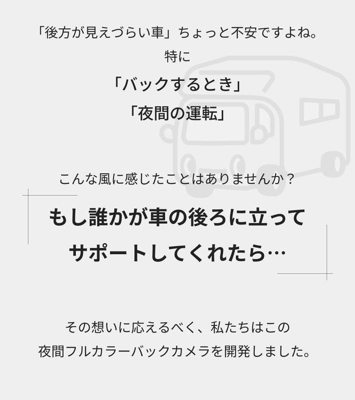 「Makuake(マクアケ)」は、実行者の想いを応援購入によって実現するアタラシイものやサービスのプラットフォームです。このページは、 プロダクトカテゴリの 「夜間フルカラー映像!後退時はAIが!後方の不安を解消し夜道の運転をサポート!」プロジェクト詳細ページです。