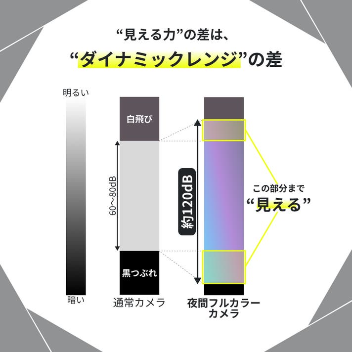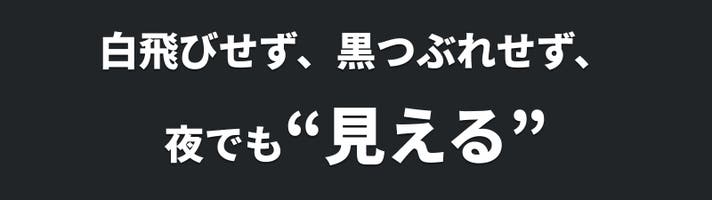 通常カメラのダイナミックレンジが60~80dB程度なのに対し、本製品のカメラは約120dBの広ダイナミックレンジを実現。白飛びや黒つぶれを抑え、夜道や逆光でも映像が見やすくなります。