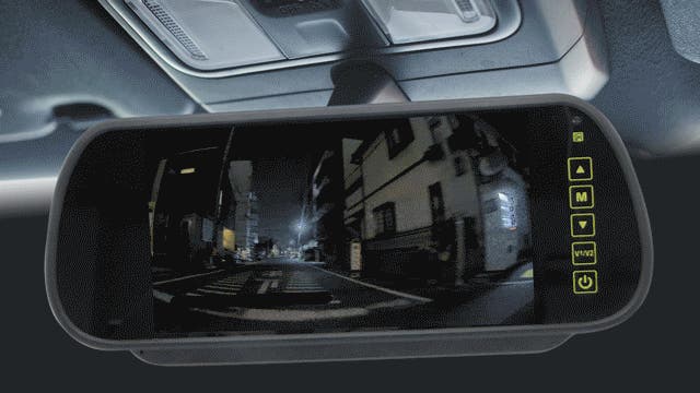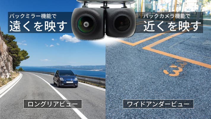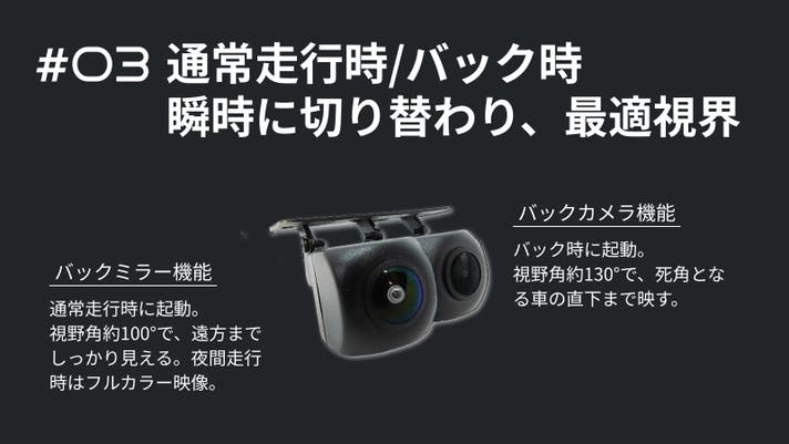 - バックミラー機能とバックカメラ機能。異なる機能を持つ2つのカメラが自動的に切り替わる