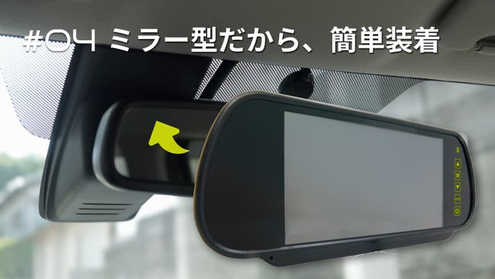 本製品は、ルームミラーにそのまま装着可能な7インチミラー型モニター。面倒な作業不要で、簡単装着。