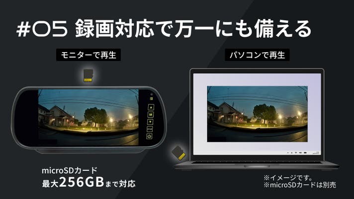 microSDカードを挿入すれば、2台のカメラによる映像を約37時間にわたって同時に録画可能。録画容量がいっぱいになると、古いデータから順に自動で削除され、常に最新の映像を保存する「ループ録画機能」を搭載しています。あおり運転や万が一のトラブル発生時にも、貴重な証拠としてしっかり記録されるため、安心・安全をサポートします。
