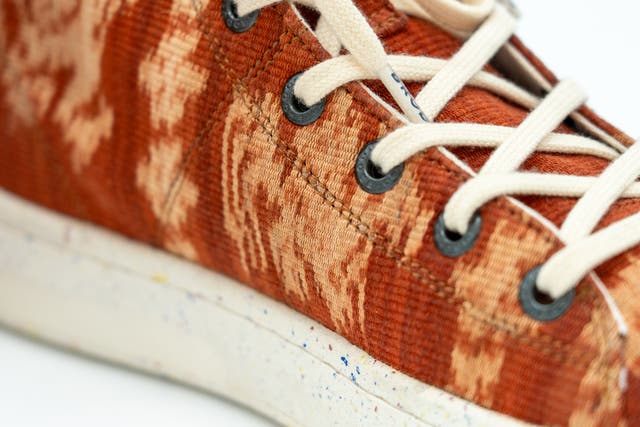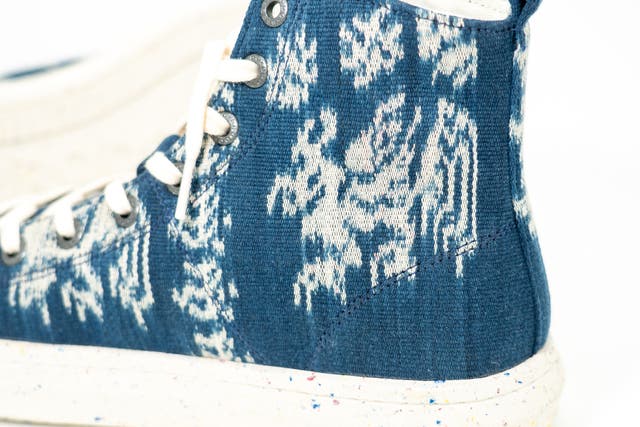 今回のスニーカー制作プロジェクト専用(写真はハイカット用)に島民と一緒に考案したテヌンイカット生地です。