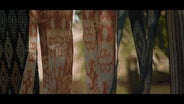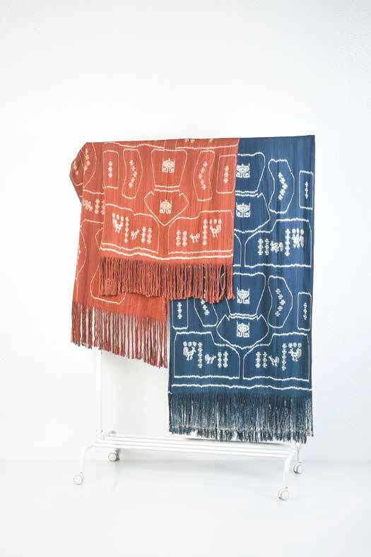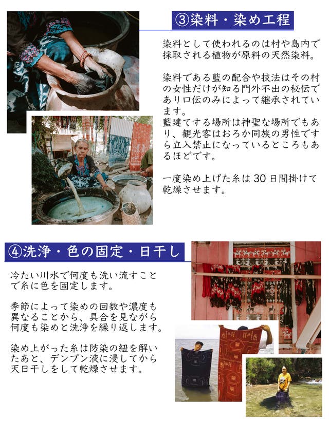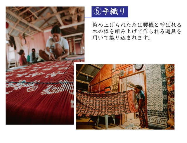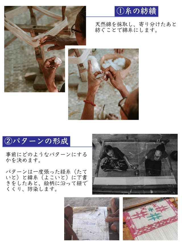 染織物は織り込んで作った一枚の布を染め上げることで模様を作る方法はよくある手法ですが、テヌンイカットは、織る前の糸の状態で完成形に合わせて染色し、絵柄をピッタリと合わせながら織り上げる大変手間のかかる技法によって作り上げられています。