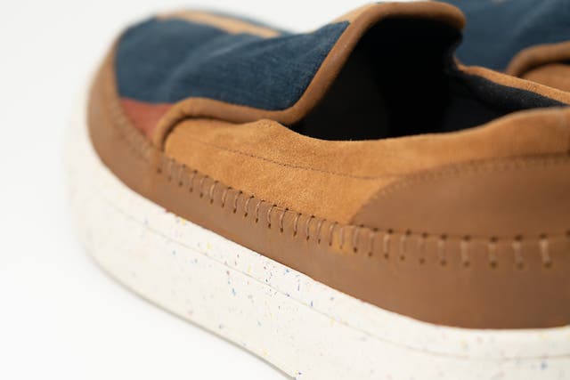 今回ご用意したスリッポンタイプでは、分厚いなめし革とスエード皮を切り替えていたり、生地の末端処理を革素材でパイピングしています。
