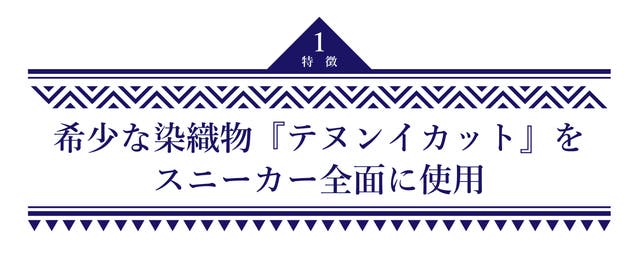 スニーカーに描かれているモチーフは、スンバ島でまだ文字のなかった時代に、一族の存続と繁栄を願う心を布に織り込め、先祖から後世へのメッセージとして伝承されてきた本物の民族柄です。