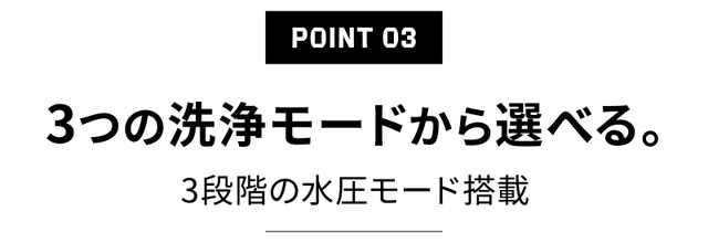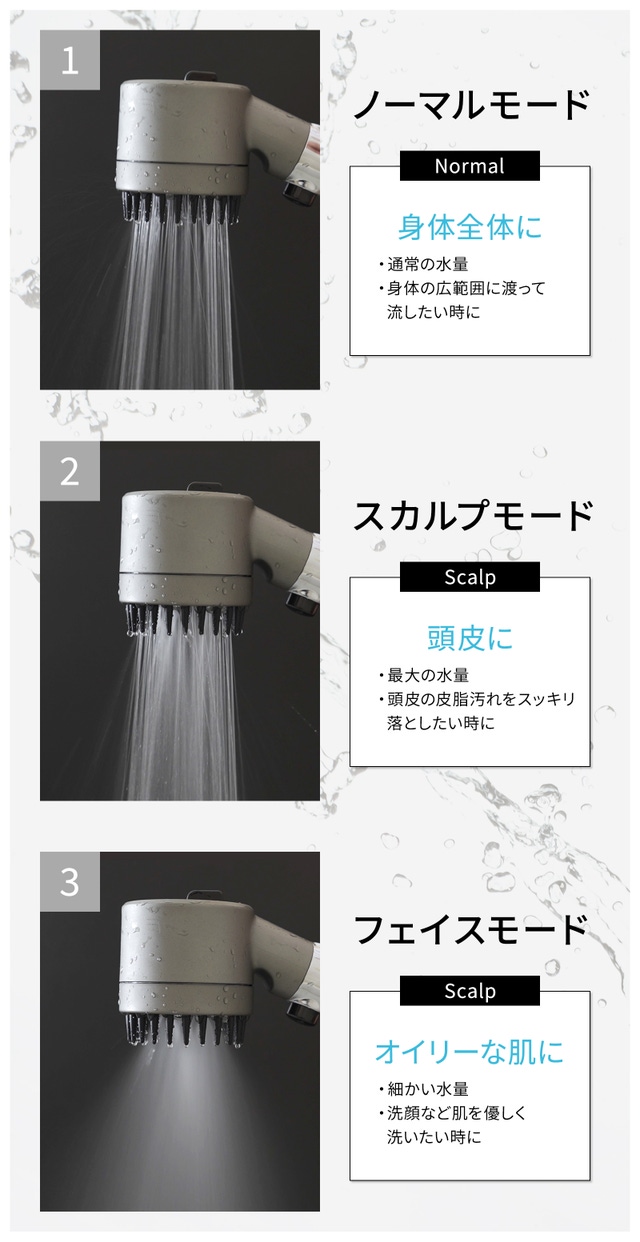 3モード切替レバーで、Normal(ノーマル)・Scalp(スカルプ)・Face(フェイス)から選択できます。強めの水圧がいい!柔らかい水圧がいい!など、小さいお子様からご高齢の方まで幅広い方のお好みに合わせて、水圧を使い分けることができます!