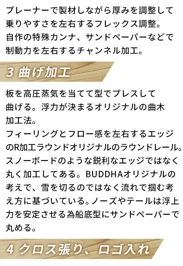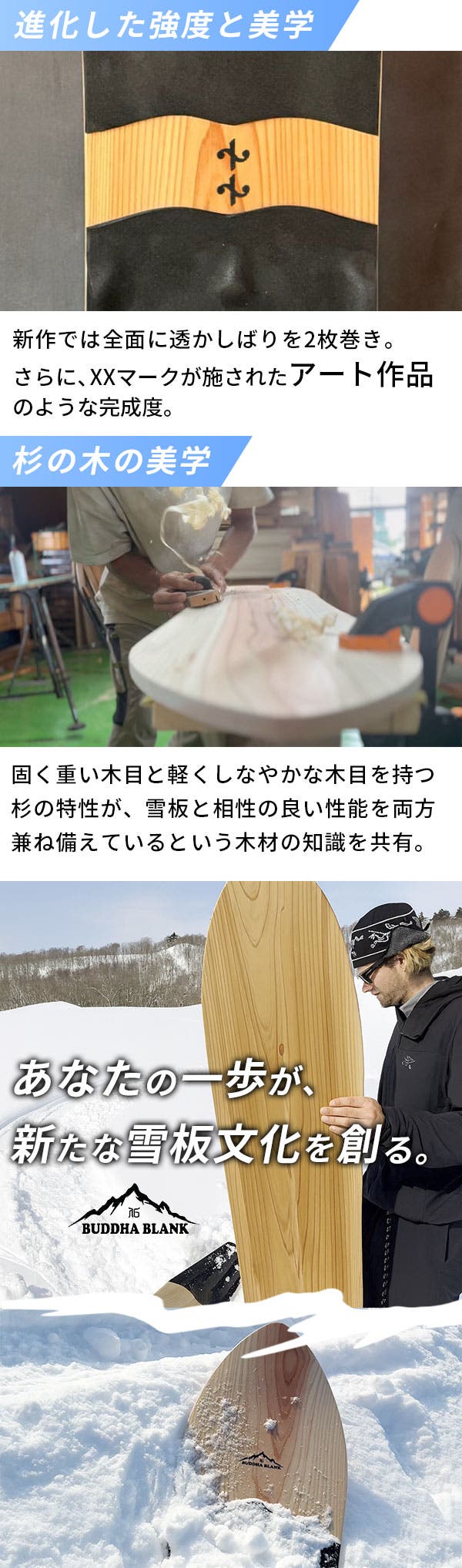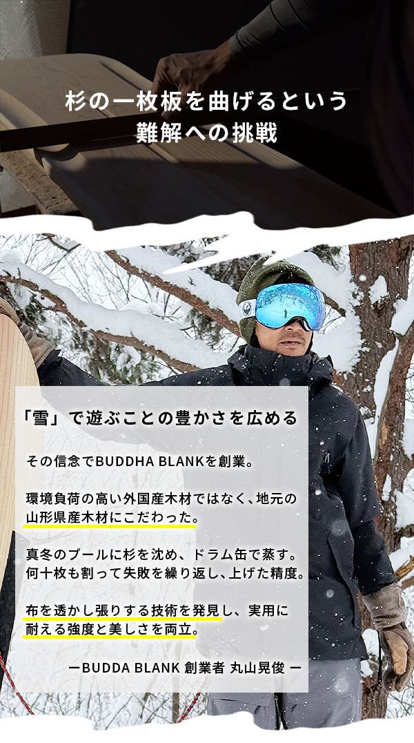 BUDDHA BLANKの雪板は木が持つ力を損ねぬよう細心の注意を払い丹念に作られている。