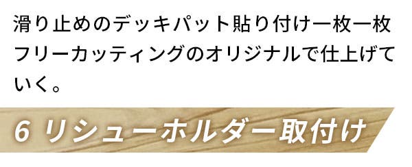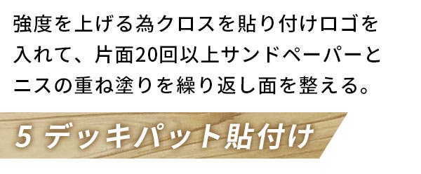 シーズンオフに全塗装される際は、上記同様に全体のワックスを落とします。次に#240から#360のやすりで全体を磨き、マスキングテープでデッキ面を汚さないように養生して、薄く塗り重ねてください。仕上げにワックスを塗って#400のやすりで縦に磨いてください。