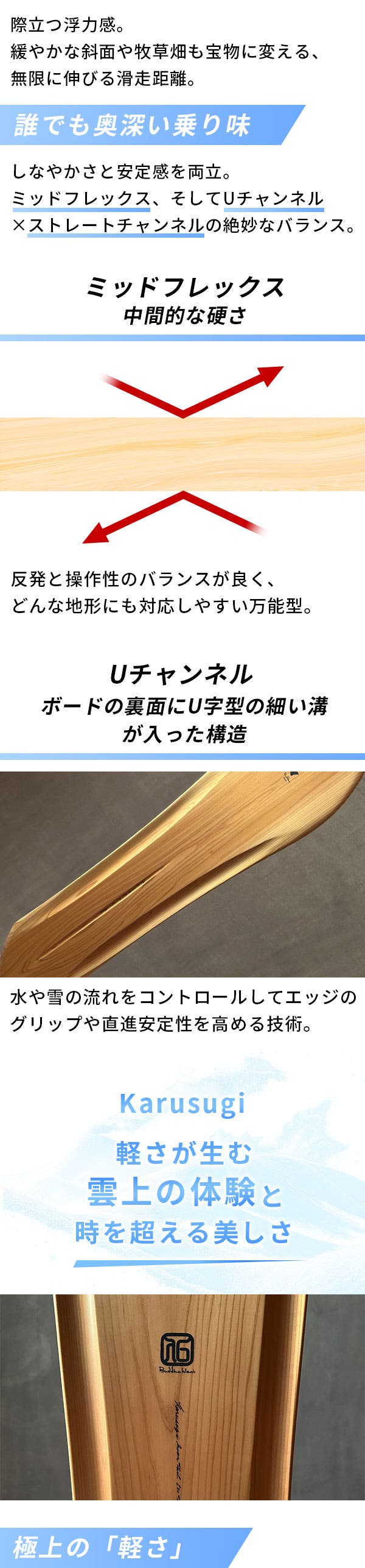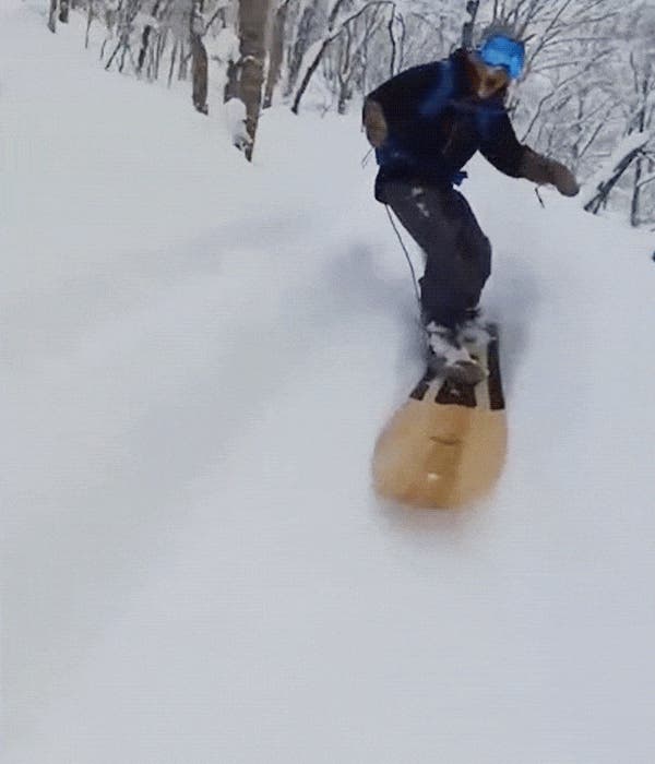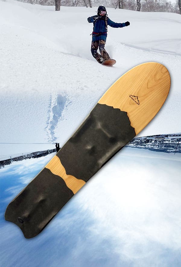 現在、日本人の手による雪板は、主に木と布でつくられ、自然との親和性が高く、繊細かつ芸術的。そのクオリティは海外でも高く評価されています。海外では “スノーサーフィン” や “パウサーフィン” とも呼ばれますが、日本の雪板にはまた違った趣があります。