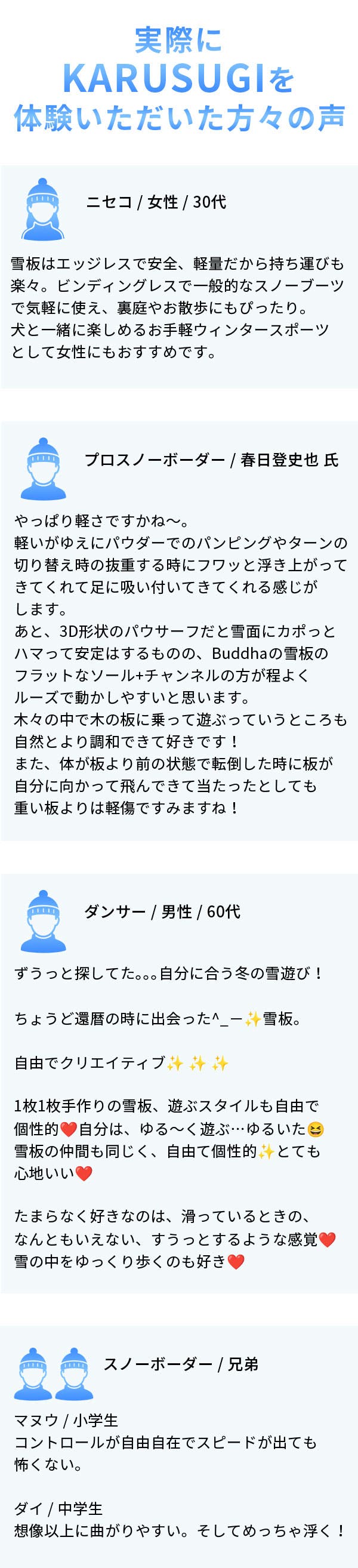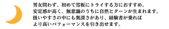新雪で転んでも痛くありませんが、スキー場などの圧雪の上ではコントロールできず、怪我や雪板の破損リスクを伴いますので、お控えください。
