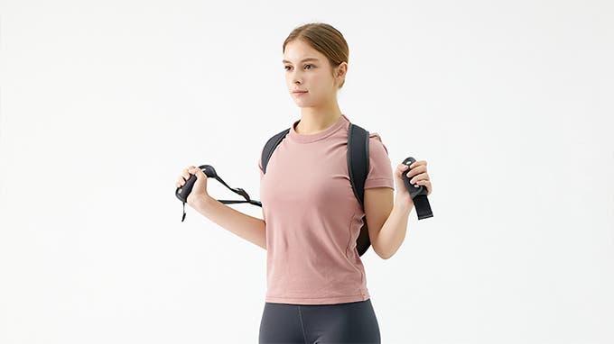 - 1日たった5分!リュックのように背負い、引っ張るだけの簡単ストレッチ!
