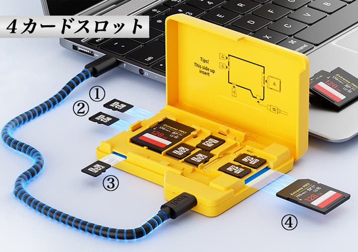 付属のUSB-Cケーブルをパソコン、スマホ、タブレットに接続するだけで自動認識。電源要らずで転送速度5Gbpsのハイスピード!4枚同時にデータの読み書きがスムーズに行えます。