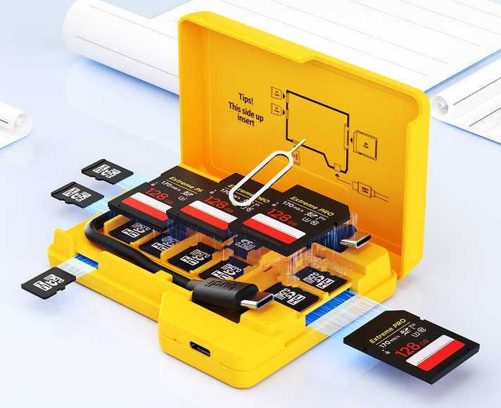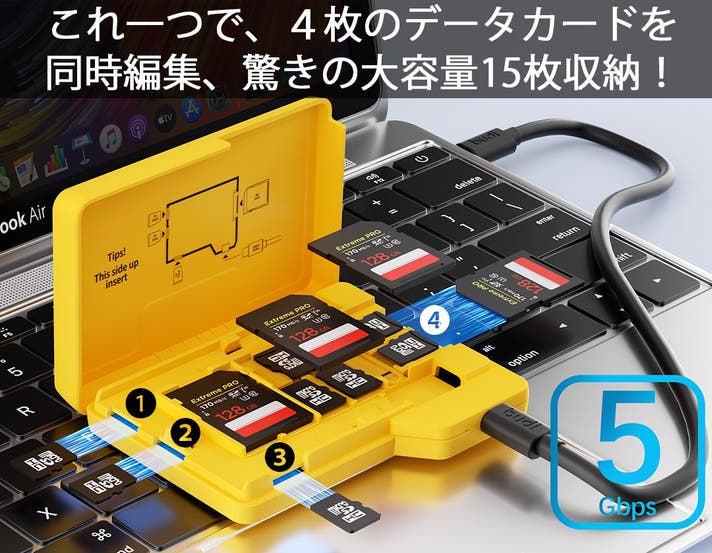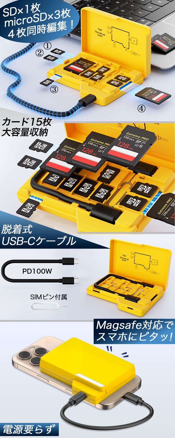 同時に4枚のカードがそのまま読み込めて、合計15枚ものデータカードを本体に大量収納、埃なども入らないように考えられたケース内にはUSB-Cケーブル(PD100W)、SIMピンも収納されています!