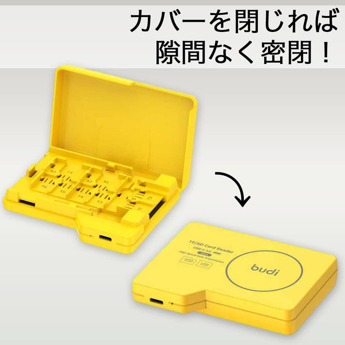 また「budi」のメーカー色でもあるイエローを採用することで、オシャレで他とは違った見つけやすさ、黒くて小さいデータカードやケーブルの視認性も格段に上がっています。