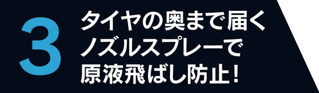 - タイヤの奥まで届くノズル装着で丁寧な施工が可能!冬の風の中の噴射時でも原液飛ばしを十分抑える!