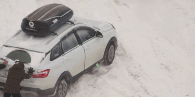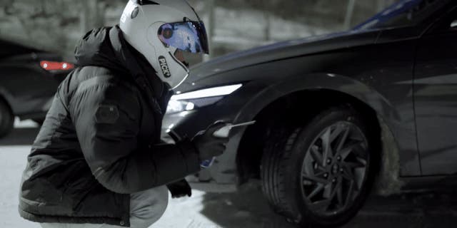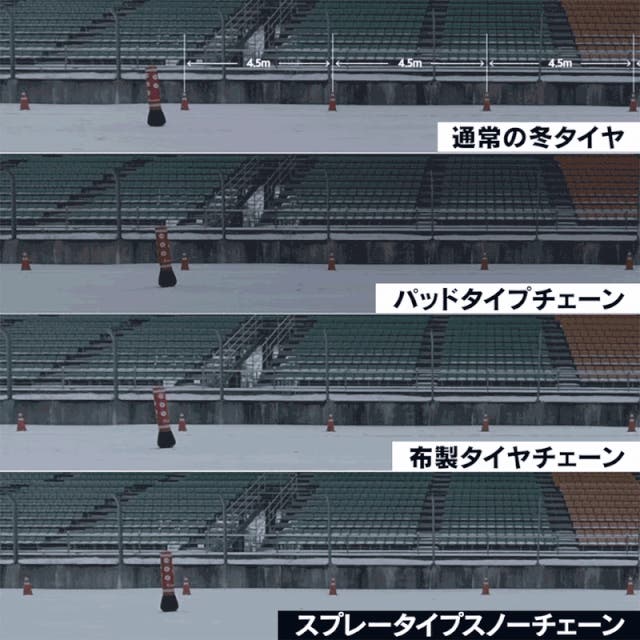 雪道30km/h制動距離試験を行った時の様子です。冬タイヤで雪道を走るよりこのスノーチェーンを使用し走る方がはるかに制動距離が短いことが分かります。