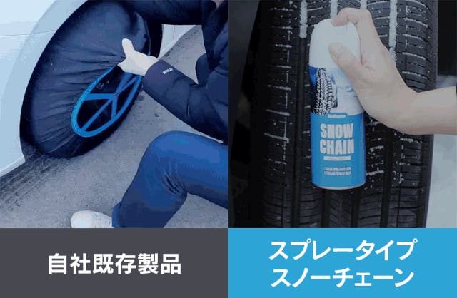 自社既存のタイヤに直接設置するスノーチェーンと比べてスプレータイプのスノーチェーンは手間のかかる設置過程を省き、タイヤにシューッとスプレーをするだけで寒い日でも素早く使用できます。