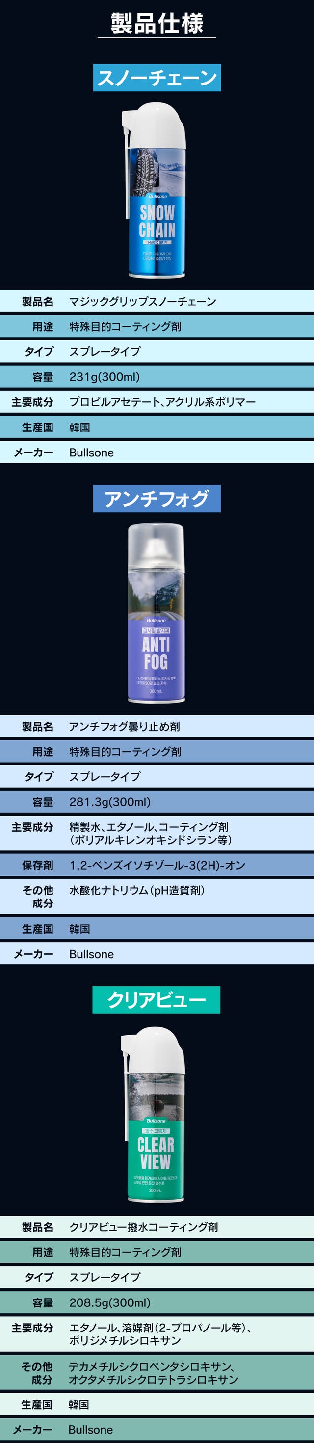 スノーチェーン3本+アンチフォッグ1本+クリアビュー1本セット