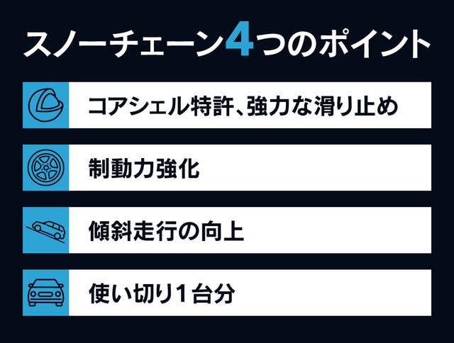 ・タイヤに直接取り付けるスノーチェーンと同じ性能ではないので、その点ご了承ください。