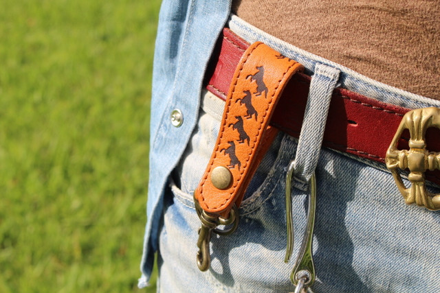 真鍮製の蹄鉄バックルと二重リングを使用したキーリングです
