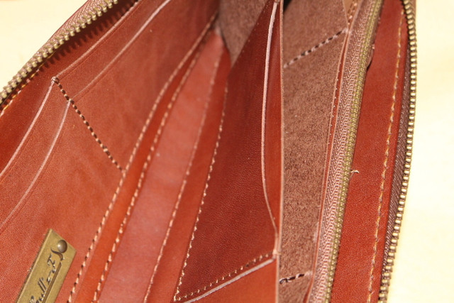 一般的なラウンドファスナーの中仕様と違い、蛇腹部分に特徴があり、お札の端が折れにくく蛇腹を片方だけにして、お札やカードの出し入れがし易くなっています。