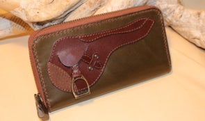 レース鞍を型取ったラウンドファスナーロングウォレットです。