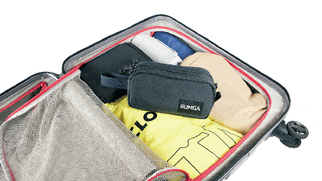 出張中の「このポーチが半分になれば」 という思いを実現。ガジェット収納に最適化した設計で、わずか3cmのすき間に入るポーチが完成しました。