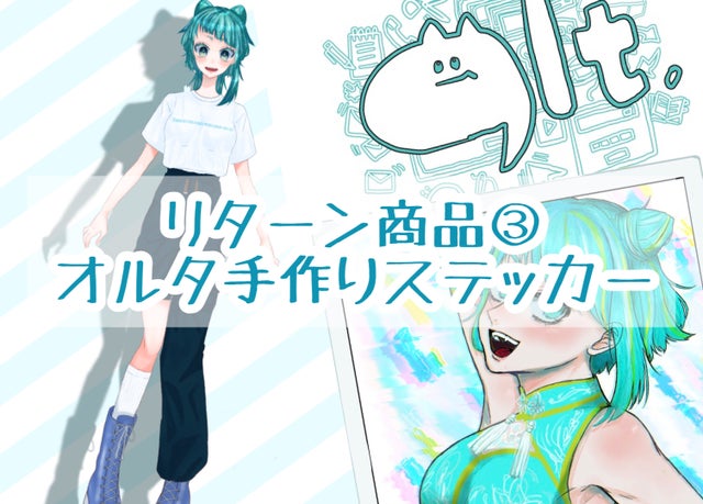 今回のリターン商品のTシャツのバックプリント、リターン商品を着たオルタの立ち絵、頭身オルタイラスト、これら3種のイラストをステッカーにして一つ一つオルタが心を込めてお届けします!