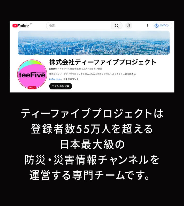 東京都中野区を拠点に、地震・防災情報配信・映像制作・防災プロダクト開発を行う企業です。 YouTube防災チャンネル「株式会社ティーファイブプロジェクト」では、地震速報や防災情報を配信し、防災DXメディアとして全国的な信頼を獲得。 災害現場の実体験をもとに、より“現場に強い防災”を実現する製品開発に取り組んでいます。