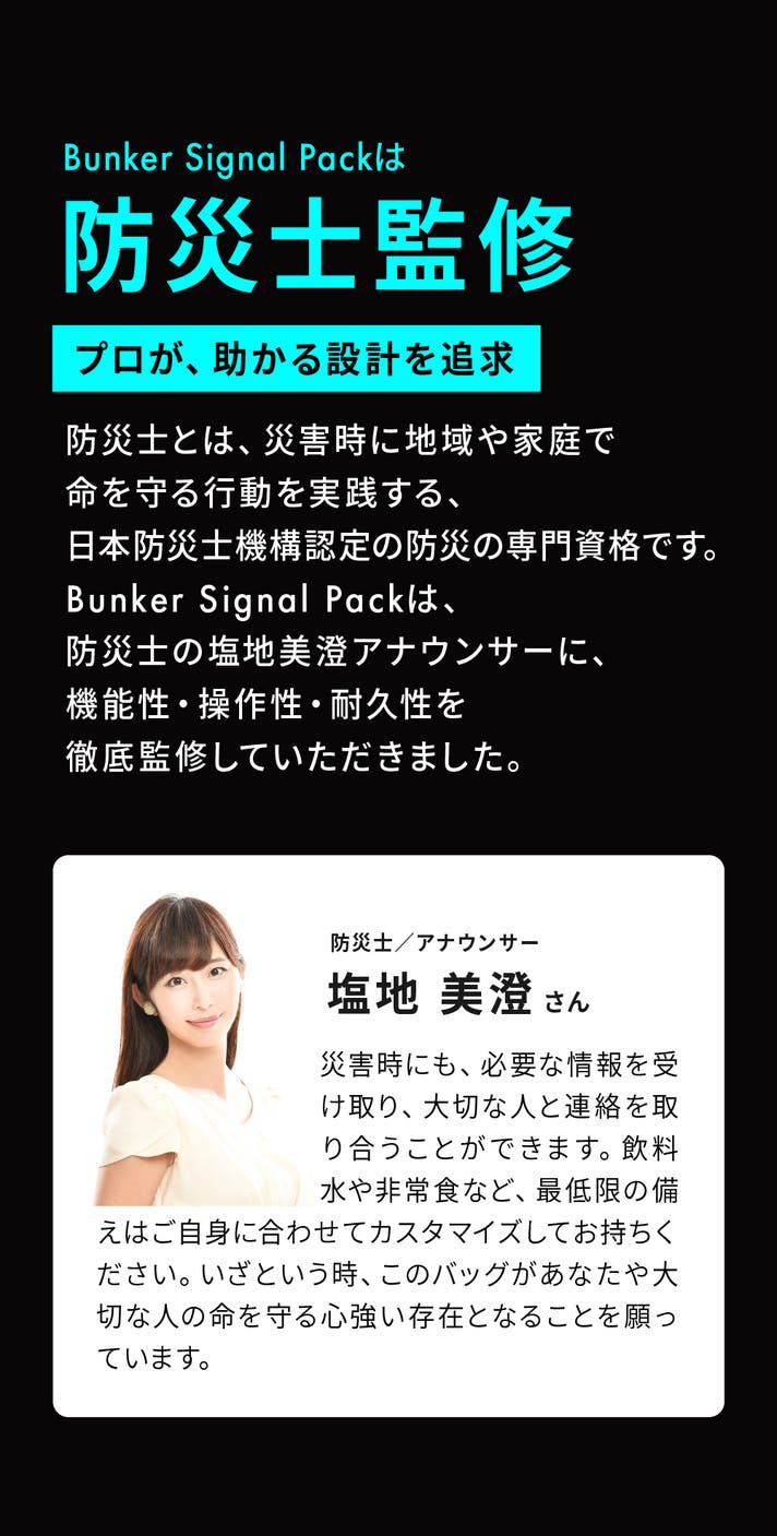 その想いから誕生したのが、「Bunker Signal Pack」です。 日常に馴染むデザインと、災害現場に通用する堅牢性。 「備えること」を、特別なことではなく“生活の一部”にする──