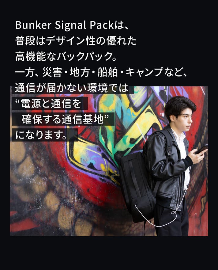 その想いから生まれたのが、 Bunker Signal Pack(バンカー・シグナルパック)です。 防刃・撥水素材を採用し、過酷な現場でも耐えうる堅牢性を備え、 Starlink miniを収納して電源供給できる構造を持つ。 つまり、“持ち歩ける通信基地”という新しい概念。 災害現場はもちろん、離島・船舶・登山・キャンプ・屋外撮影── あらゆる場面で「通信を切らさない」という思想を、 美しいデザインの中に形にしました。