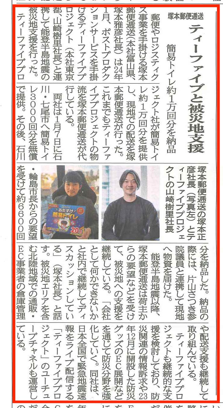 YouTubeチャンネル「株式会社ティーファイブプロジェクト」運営(登録者数55万人以上) 自社ブランド「Bunker」にて簡易トイレなどを展開 2024年能登半島地震で簡易トイレを現地支援として配布