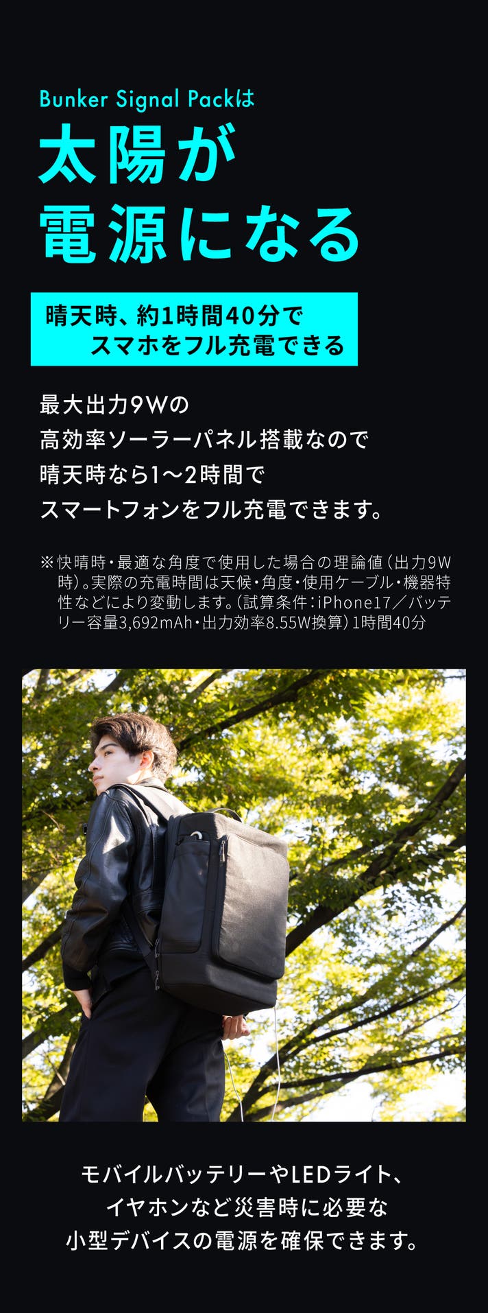 ※天候や使用環境により前後します。 快晴時・最適な角度で仕様した場合の理論値(出力9W時)実際の充電時間は天候・角度・仕様ケーブル・機器特性などにより変動します。(試算条件:iPhone17/バッテリー容量3,692mAh・出力効率8.55W換算)1時間40分