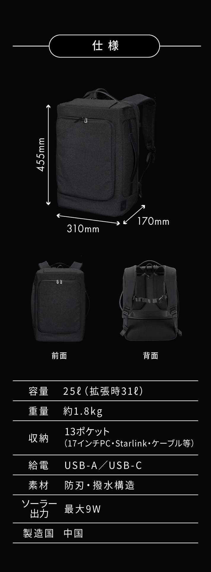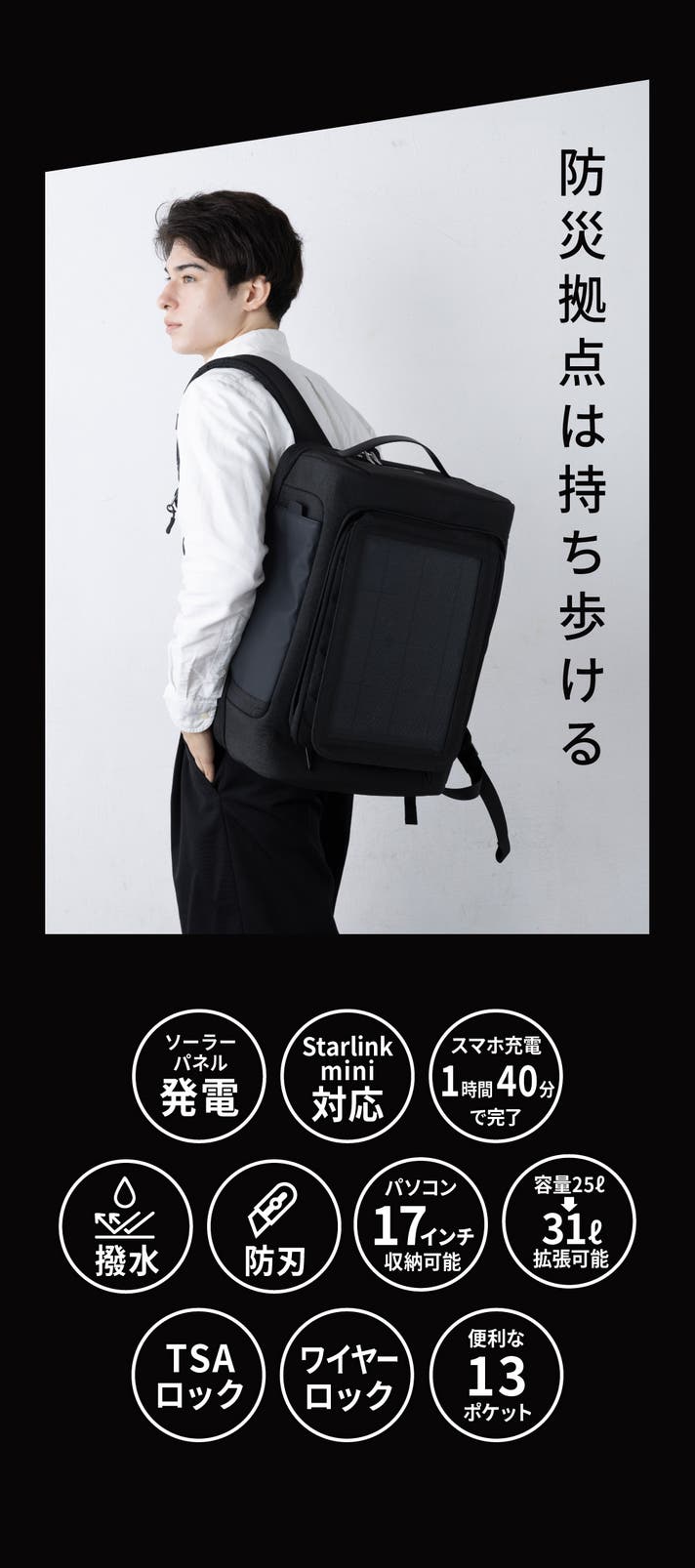 A. もちろん可能です。 見た目はハイブランドのビジネスリュックのような上質さで、 通勤・出張・キャンプ・防災のすべてを1つに統合できるデザインです。