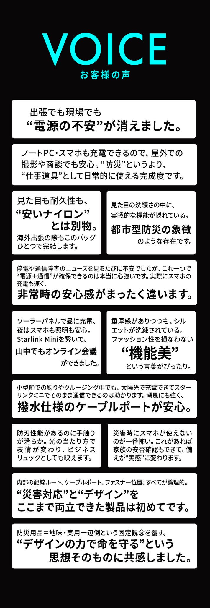 私たちはこれを、単なる防災用品とは考えていません。 それは、日常に溶け込む“平時からの備え”。 どんな時も「繋がっていられる」という安心を届ける、 次世代のライフライン・ギアです。 Bunker Signal Pack は、情報発信の現場から生まれた、 “実体験に基づく防災テクノロジー”の結晶です。