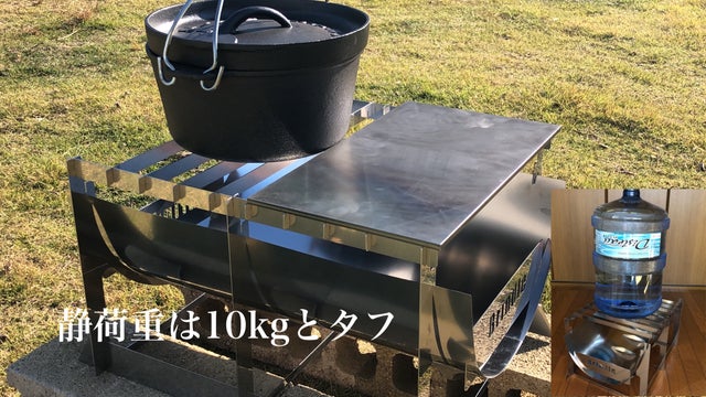BurnMoreは焚き火台としてだけではなく調理に特化しています。広い調理面積と静荷重10kgのタフなボディーには重い調理器具をのせることが可能です。
