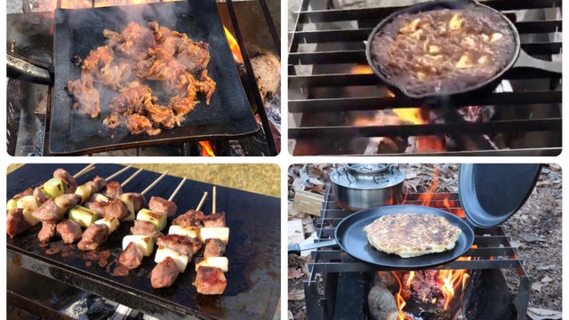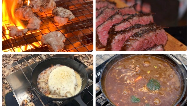網焼きホルモン、鉄板焼きのステーキ、スキレットでチーズハンバーグ、大きなダッチオーブンでシチュー