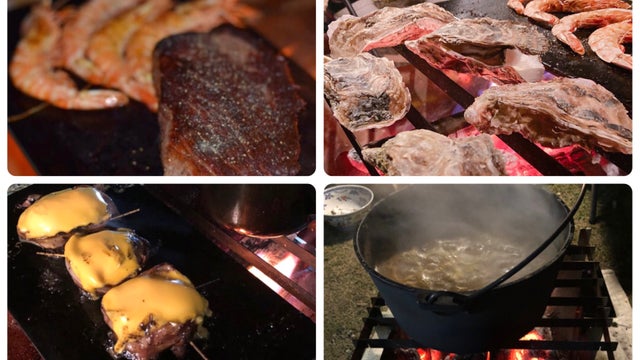 鉄板でステーキ、直火で焼きガキ、鉄板チーズ乗せハンバーグ、ダッチオーブンでズッパディヴェルドゥーラ