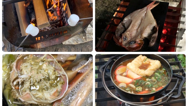 子供達が喜ぶ焼きマシュマロ、鉄板で金目鯛の開き、カニ鍋、鍋焼きうどん
