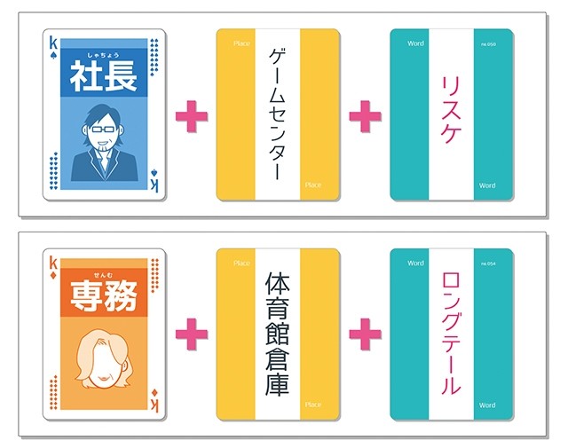 ここではオリジナルルール「社長!横文字で言うのは止めてください」のルールを簡単に説明いたします。基本的なルールは「誰が」「何処で」「何をした」に合わせてカードを引き、文章を作って発表をするというとても簡単なものです。カードの中にはビジネスと全く無い単語も収録されていますので