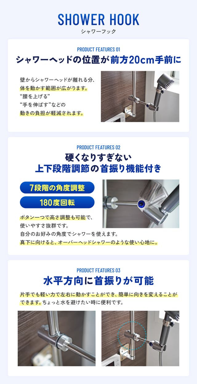 また、シャワーヘッドを20cm手前に引き寄せることで、使い心地が大きく向上し、高齢者や体の不自由な方、また介護をされる方、リウマチや関節痛に悩む方にも快適な入浴体験を提供します。