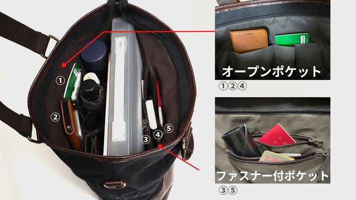 - 6ポケット搭載で小物もスッキリ整頓。マチ広で大きな書類も入り、お弁当もすっぽり入る!