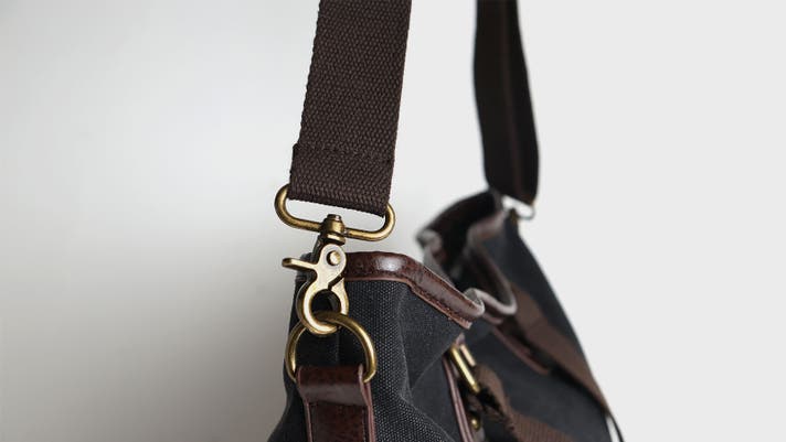 ▲まるでつり革を握っているような、握りやすい幅に設計されています。肩に掛けても食い込まず安定します。高級感のある合皮パッチワークを施し強度も増しています。