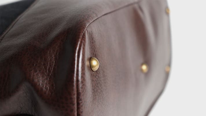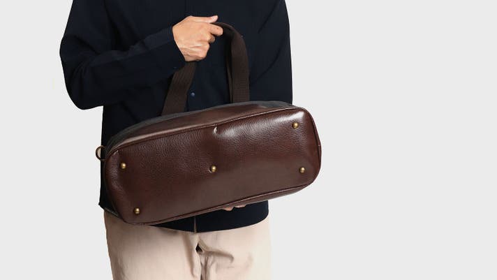 A. 持ち手の付け根はダブルステッチと鋲で補強しています。また底板もあるのでバランスよく持ち運べます。