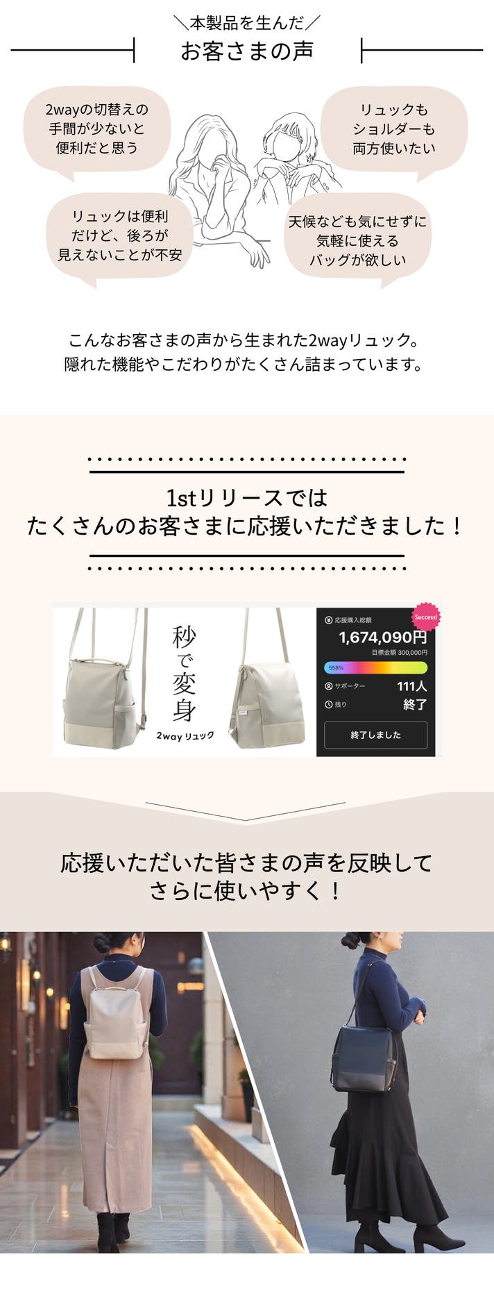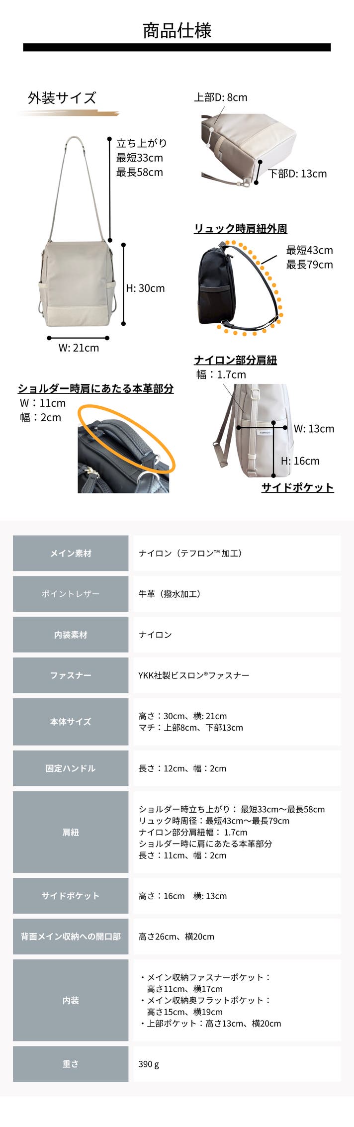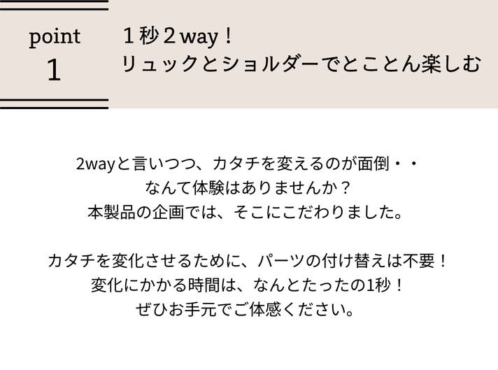 - 【機能】リュックとショルダーは1秒で切り替え可能。お客さまの声を反映し、使いやすさを追求!