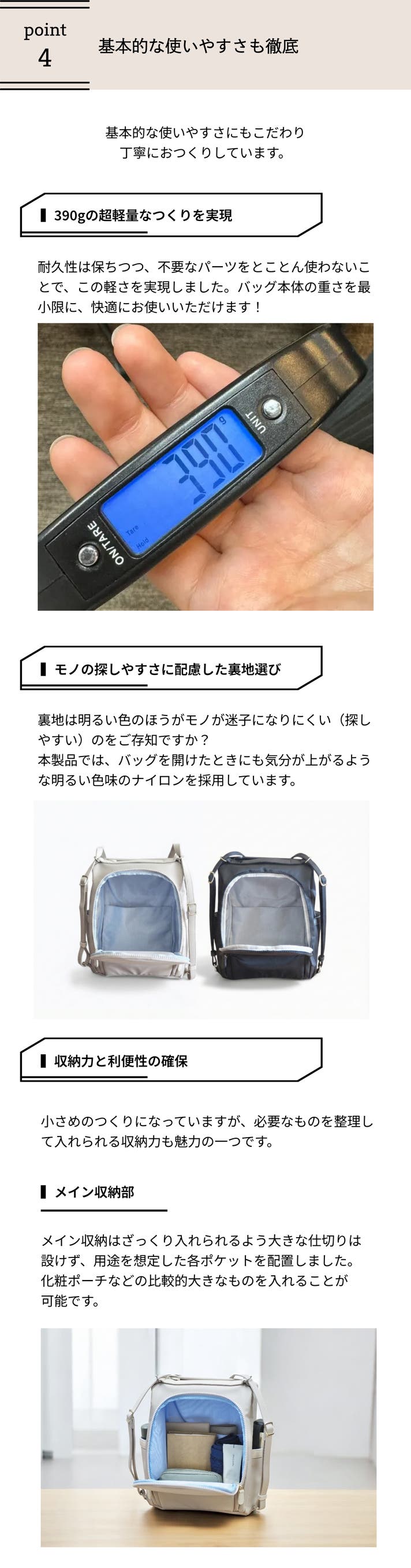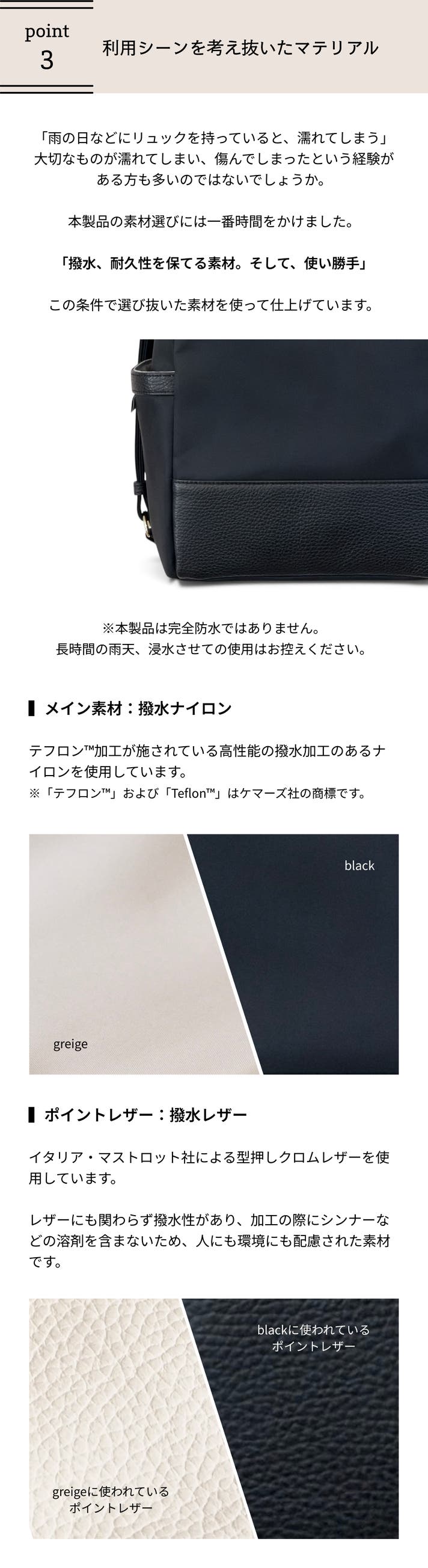 - 【素材】撥水加工ナイロンを採用し、雨や汚れに強く軽量。要所に撥水レザーを使い、上品な印象に!